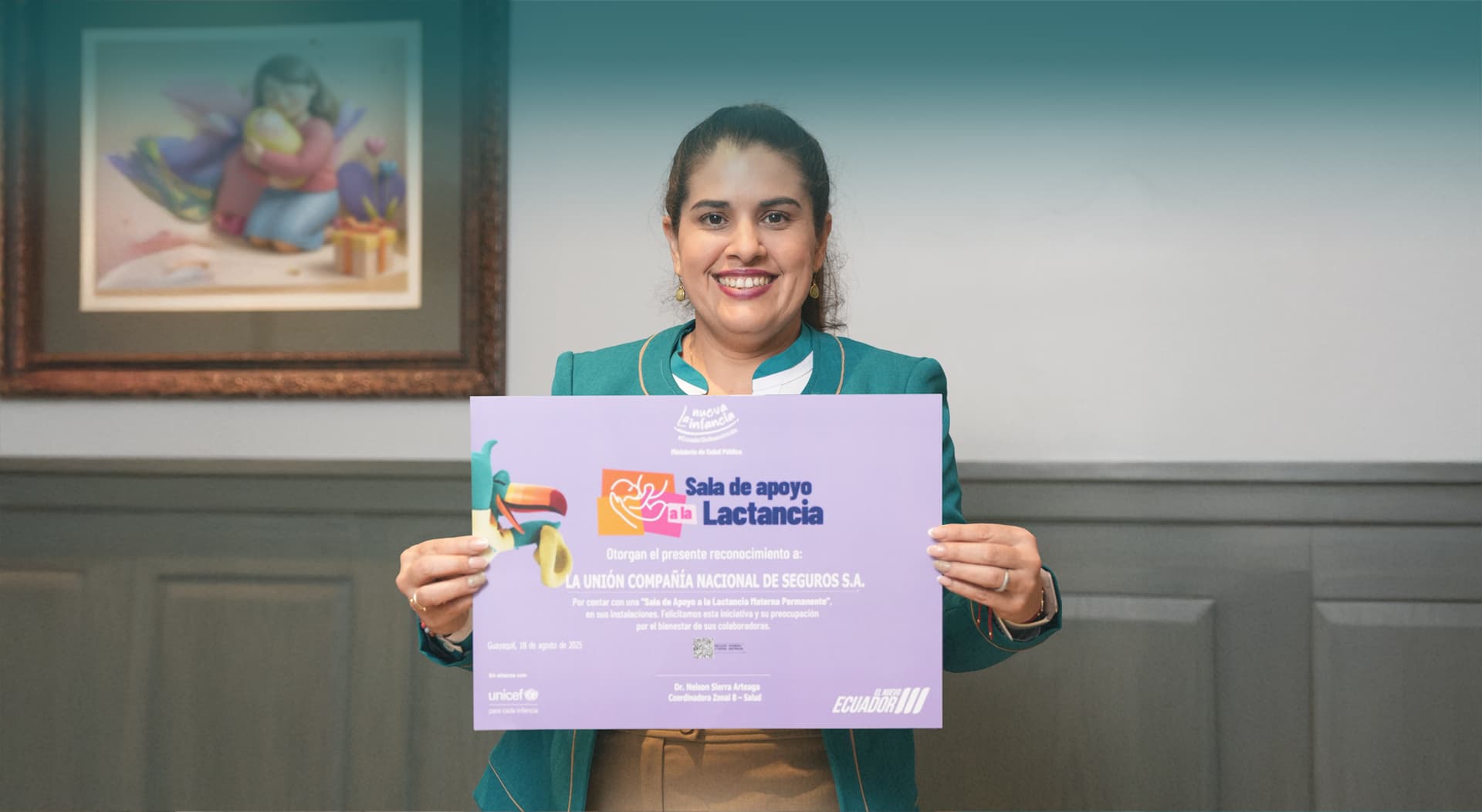 Seguros La Unión recibe reconocimiento del Ministerio de Salud Pública por su Sala de Apoyo a la lactancia materna permanente Comprometidos con el bienestar materno. Guayaquil, septiembre de 2025.Seguros La Unión, primera aseguradora del país con más de 80 años de trayectoria, fue reconocida por el Ministerio de Salud Pública por contar con una “Sala de Apoyo a la Lactancia Materna Permanente” en sus instalaciones. Este reconocimiento se enmarca en la iniciativa “Nueva Infancia – #EcuadorSinDesnutrición”, en alianza con UNICEF, y reafirma el compromiso de la compañía con el bienestar integral de sus colaboradoras y sus familias. Con esta distinción, Seguros La Unión consolida su política de salud, conciliación y corresponsabilidad, promoviendo prácticas que favorecen la continuidad de la lactancia en un entorno seguro, privado y digno, en línea con los lineamientos del Ministerio de Salud Pública y los estándares internacionales de bienestar laboral.