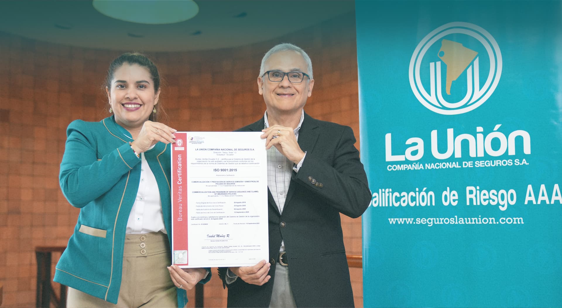 Seguros La Unión renueva la Certificación ISO 9001:2015 y reafirma su liderazgo con Calificación AAA Calidad, solidez y confianza certificadas. Guayaquil, septiembre 2025.En línea con su compromiso de ofrecer un servicio confiable y de calidad, Seguros La Unión ha renovado la Certificación ISO 9001:2015, un estándar internacional que avala la eficiencia y mejora continua de sus procesos. Esta renovación garantiza que la compañía continúa operando bajo prácticas reconocidas mundialmente, enfocadas en la satisfacción del cliente, la transparencia y la innovación constante. Además, Seguros La Unión mantiene la Calificación AAA, la más alta otorgada por Union Ratings. Esta calificación indica que la aseguradora se encuentra en una situación financiera muy fuerte, con una trayectoria de rentabilidad sobresaliente y una excelente reputación en el sector, lo que refuerza las perspectivas de estabilidad y confianza para sus clientes y aliados estratégicos. Estos reconocimientos se suman a más de ocho décadas de trayectoria como la primera aseguradora del país, consolidando a Seguros La Unión como la compañía que inspira orgullo y garantiza el futuro del Ecuador.